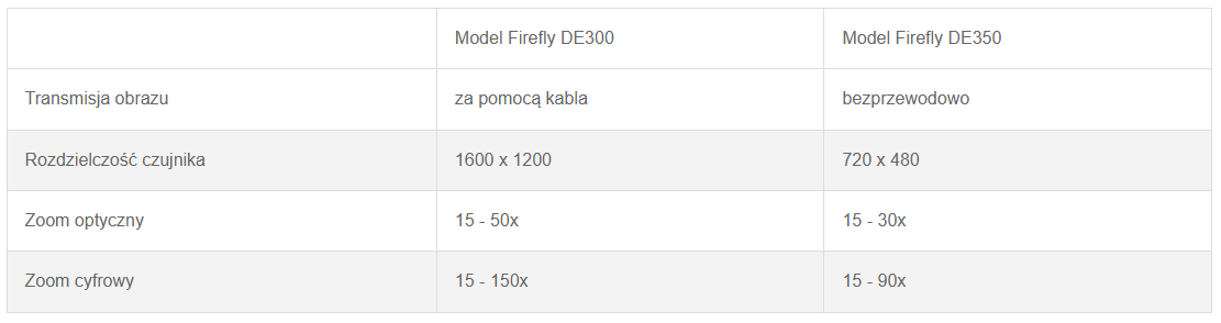 Wideodermatoskop Firefly dostępny jest w 2 wersjach z różnymi opcjami transmisji obrazu: model DE300 z transmisją obrazu za pośrednictwem kabla oraz model DE350 z bezprzewodową transmisją radiową.